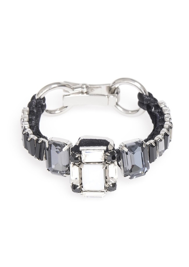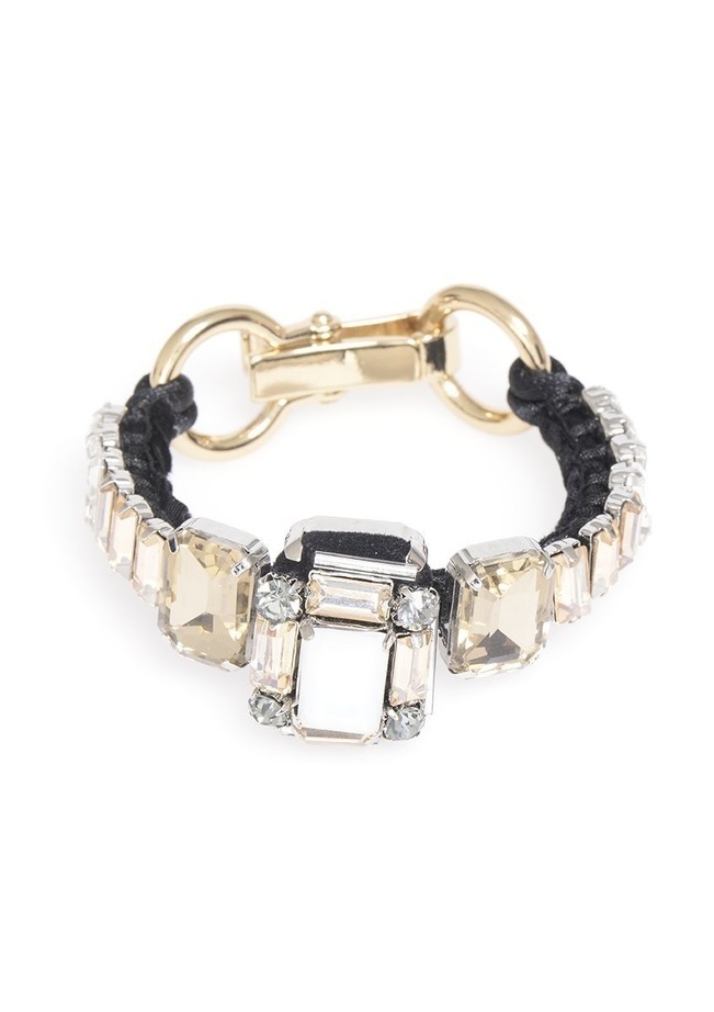 This bracelet mimics the characteristics of a blossoming spring season with it's sparkling gemstones attached to a velvet rope. The rectangular shaped gems on this collar necklace create a subtle statement piece.
