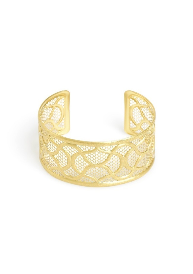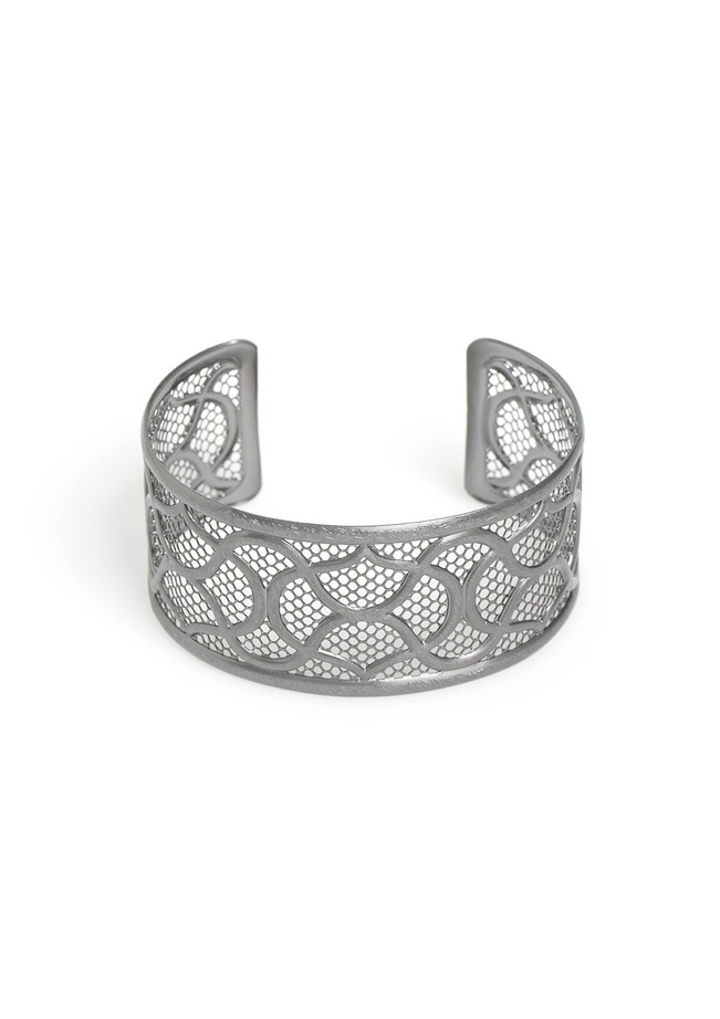 This metal cuff features a laced design.