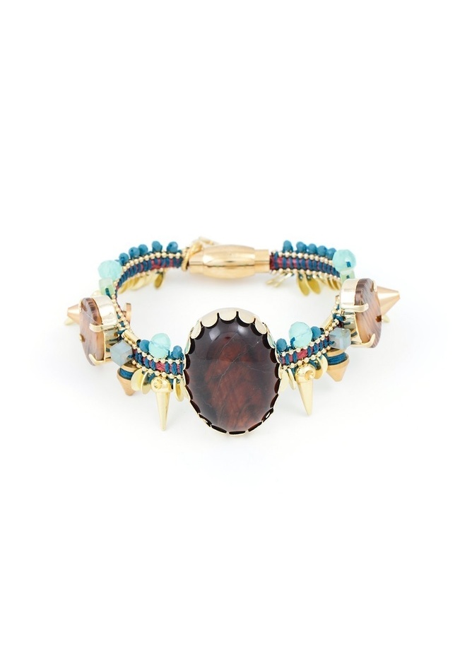 This handmade bracelet features an earthy stone side on a vibrant colored woven brand with beaded and metal spike detail.