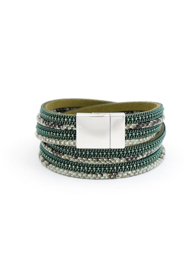 This multi-strand, vegan leather wrap bracelet features diamond cut chains and snake skin design. With its multipurpose features, you can also rock the choker trend!