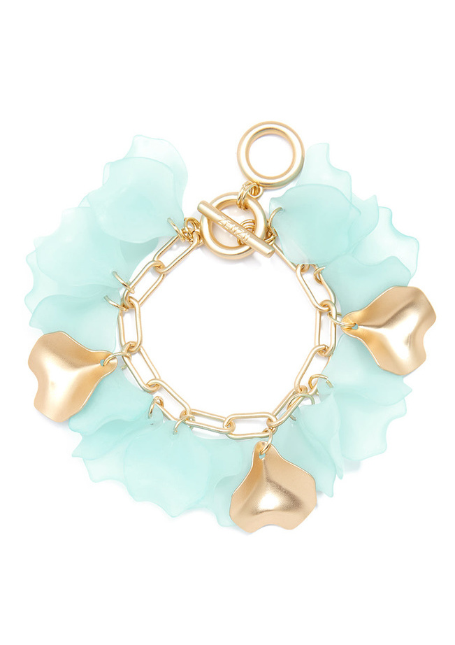 Matte, gold-tone chain bracelet with gold and sheer resin petals.