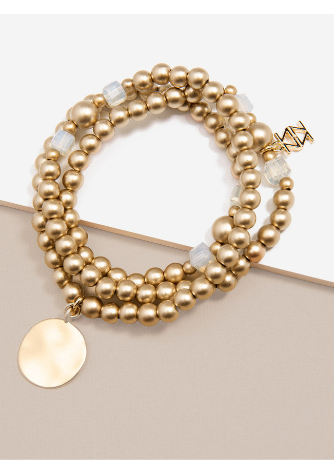 Wrap, stretch bracelet composed of lucite and matte metal beads. Features a medallion coin charm.