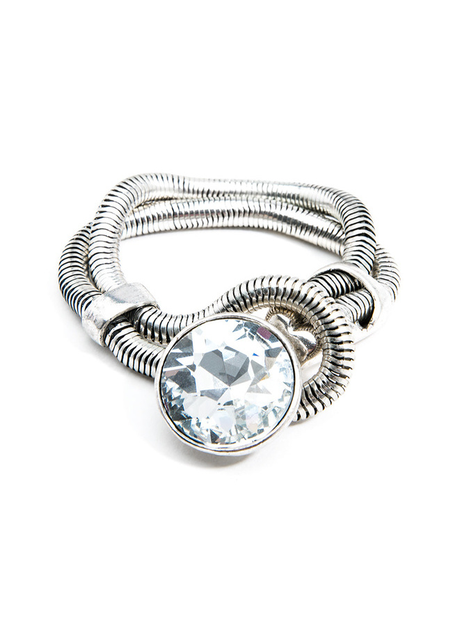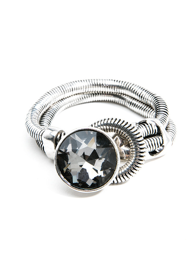 Shiny gemstone pendant held together by thick, burnished metal cords.