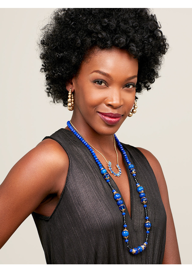 Long necklace made of handbeaded blue, glass crystals. Embellished with 18k gold-plated accents for a touch of shine. Style can be wrapped twice and worn as a choker necklace with the toggle closure.