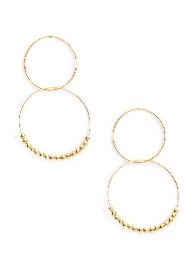 Dainty metal earring with two interlocking circles. The bottom circle has tiny metal beads.