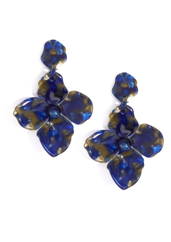 Two-piece floral drop earring with organic post shape. Made of resin and tortoise shell material with metal post back.