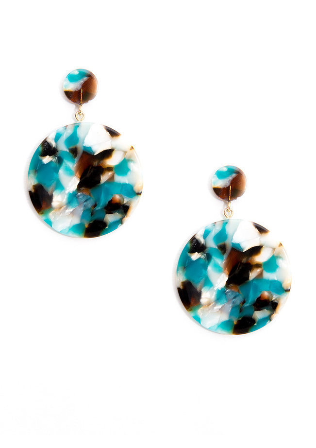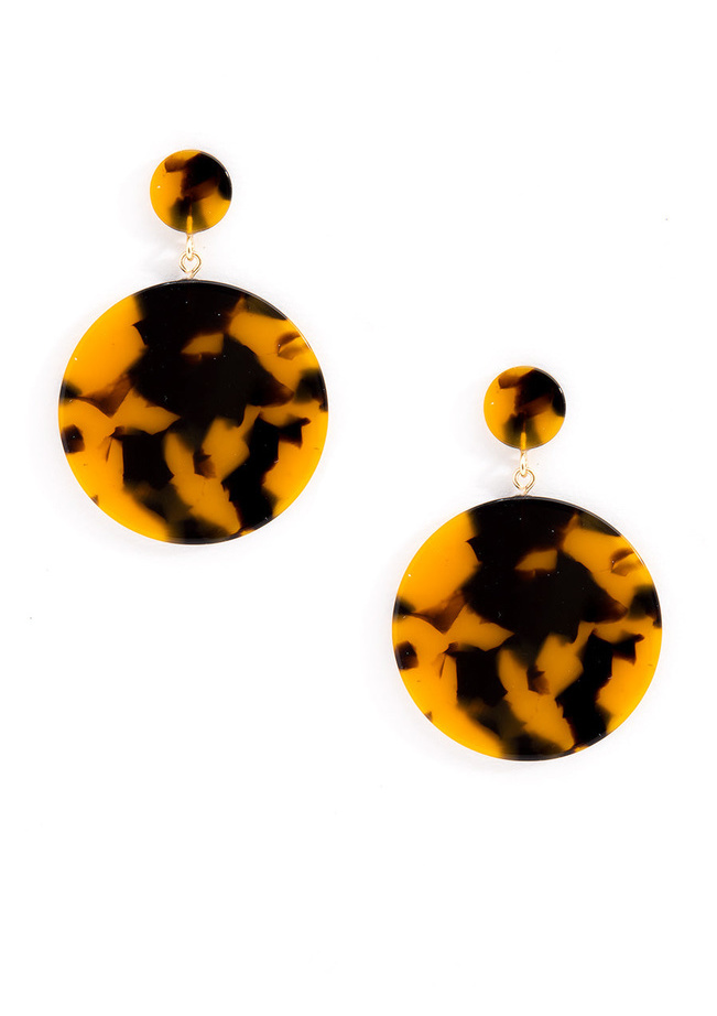 Tortoise-print drop earrings in a solid circle shape.-Post Back-2.5" Drop-1.5" Width -Nickel and Lead Compliant (Hypoallergenic)