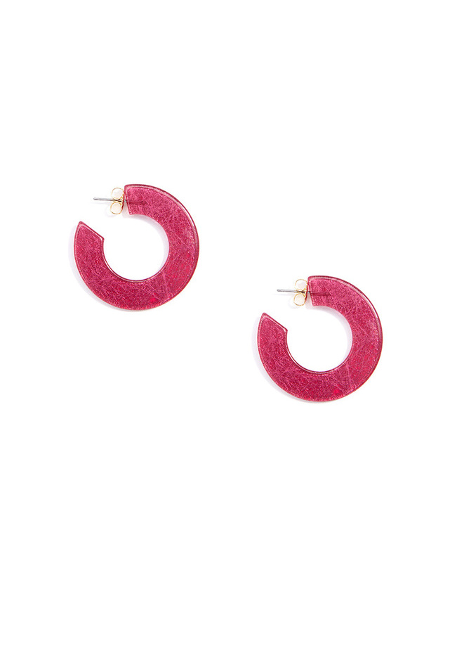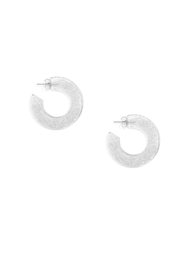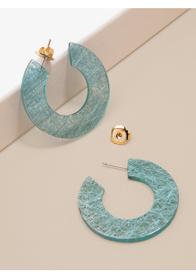 Acrylic flat hoop earring with compressed metallic silk inside for a static effect.