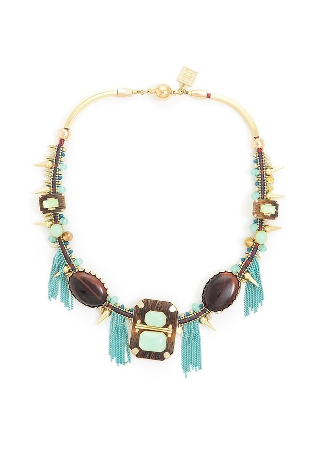 This handmade necklace features stone detailing on a woven band with a vibrant beaded fringe.