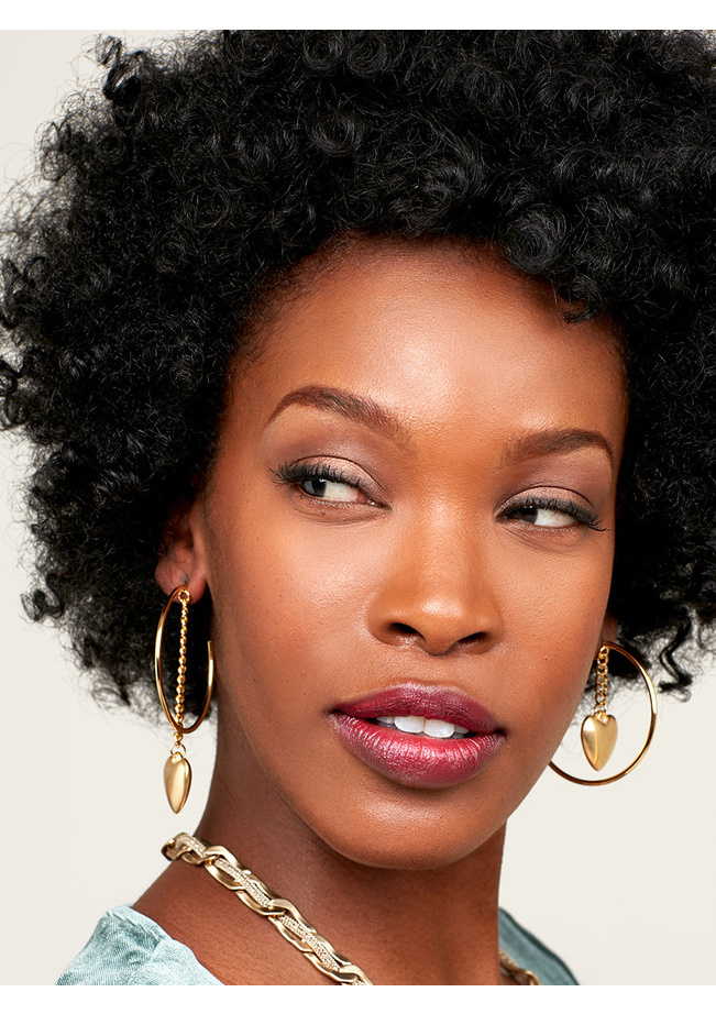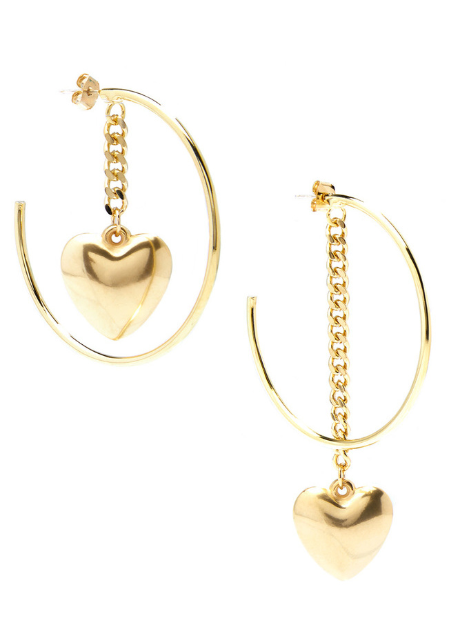 Large, c-shaped hoop earring plated in matte 18k gold. Features a dangling curb chain and heart-shaped charm.