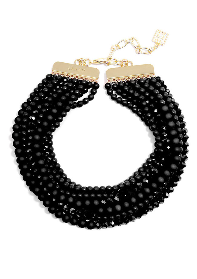 Multi-strand, short collar necklace composed of resin and crystal beads in both a glossy and matte finish.