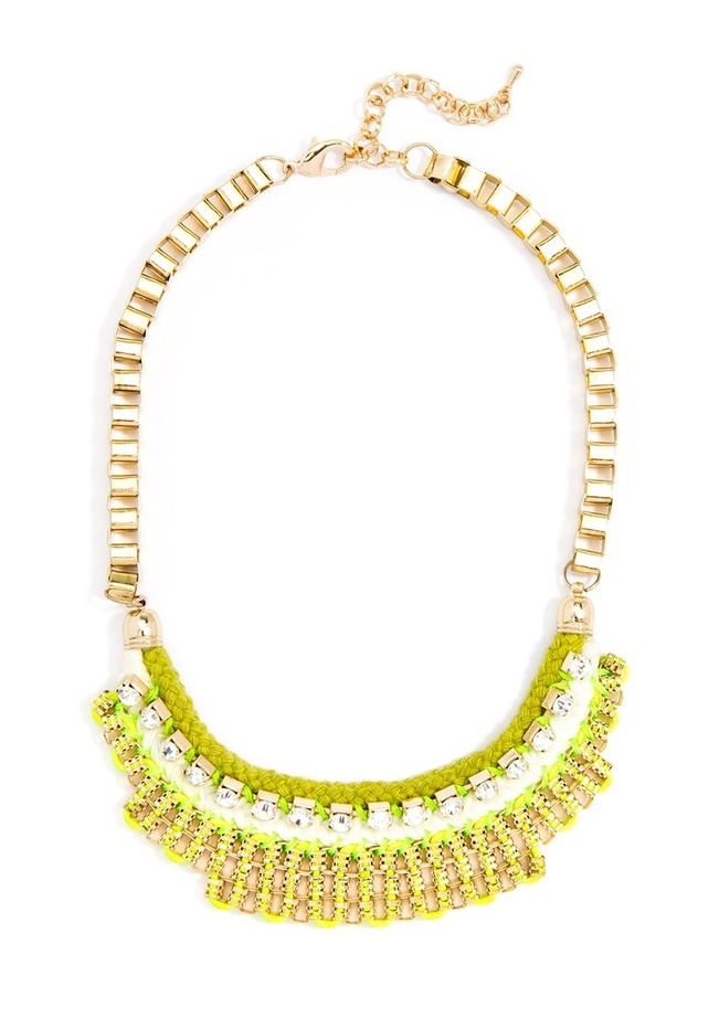This interlaced necklace gives off a boho, ethereal feel with fabric, stones, and base metal.