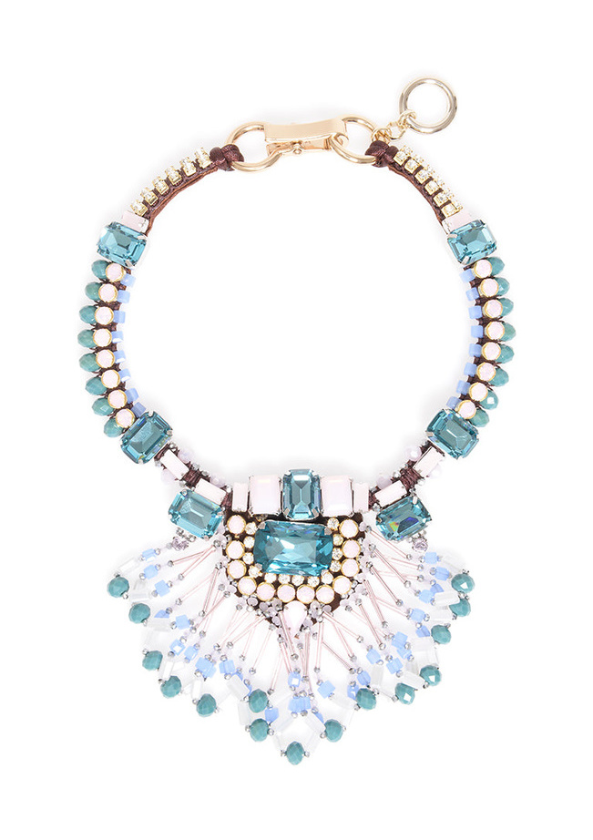 This necklace has a fun mixture of beads and sparkling gemstones. It's beaded fringe adds a bohemian touch to this bold statement necklace.
