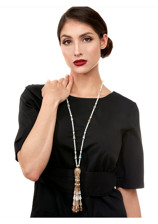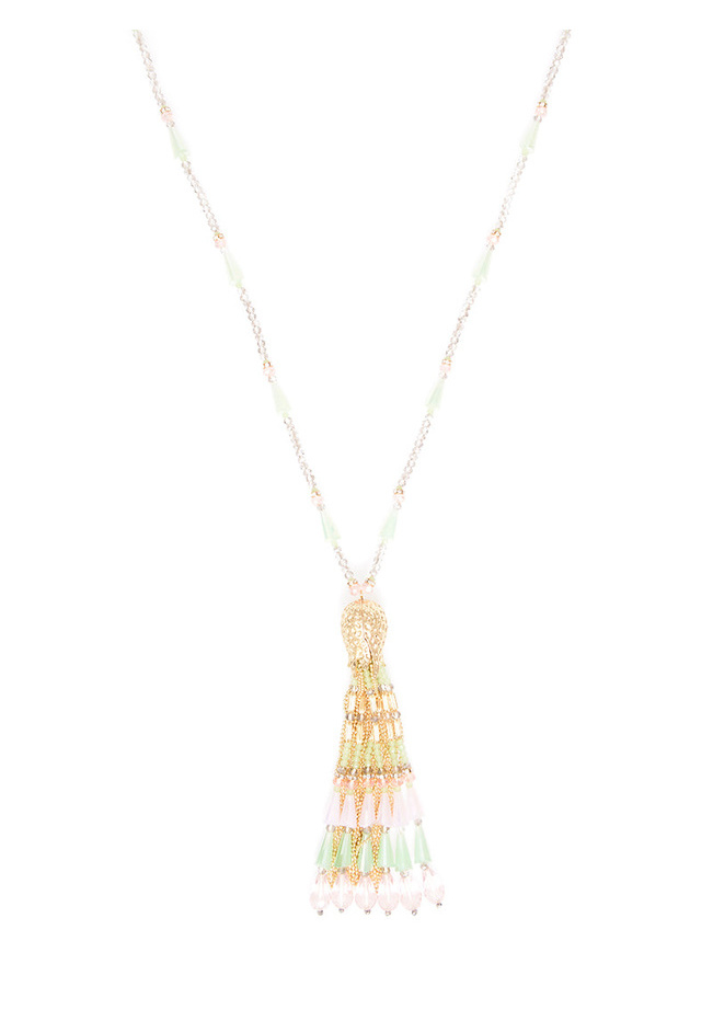 This beaded necklace features a metal tulip bulb that sprouts a beautiful beaded tassels.