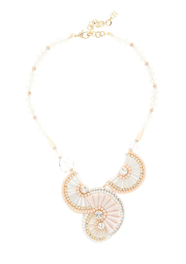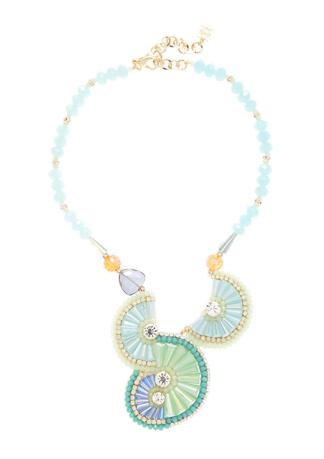 This spring inspired look incorporates a beautiful floral arrangement pendant comprised of beads and crystals.