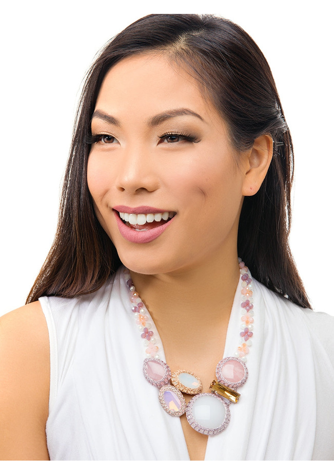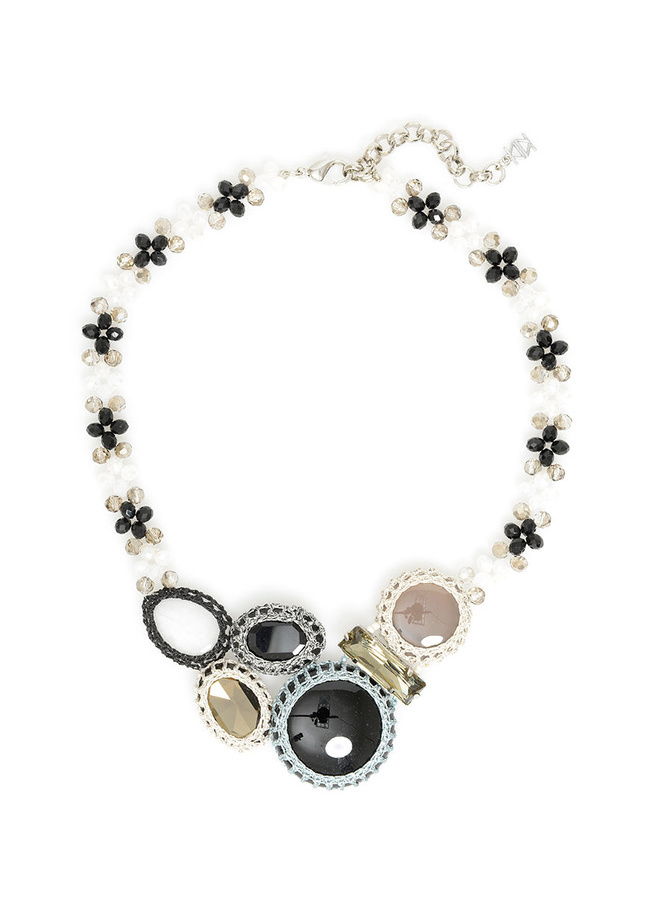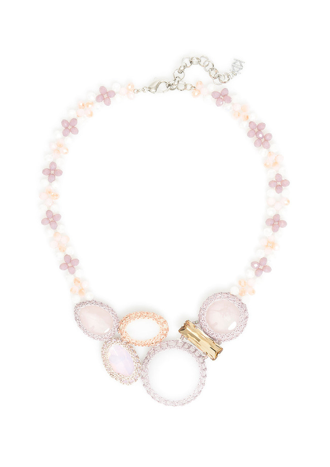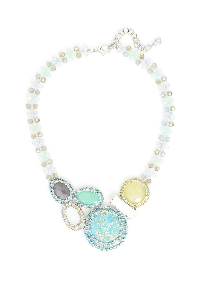 This necklace will give you an earthy vibe with it's melody of stone and gems in a woven fabric netting.