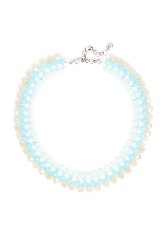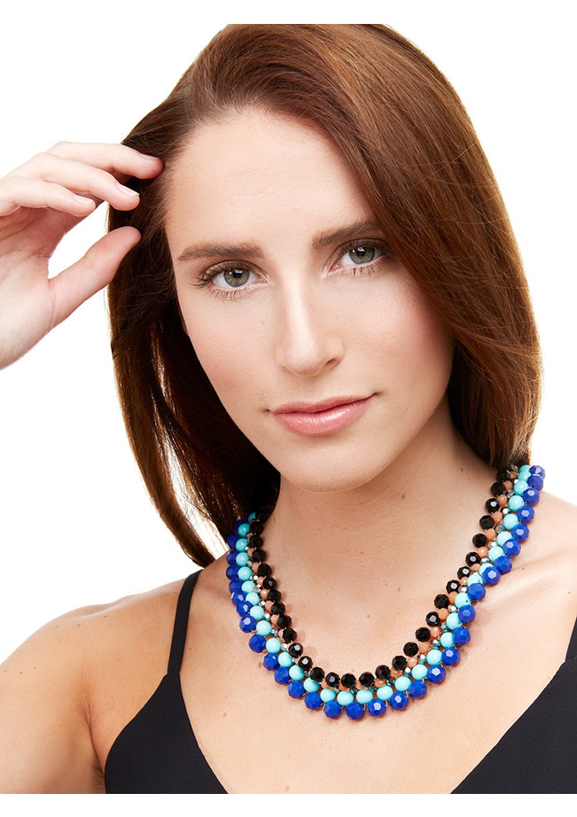 This beaded collar necklace is comprised of varying sized beads strung together in a multilayered look.