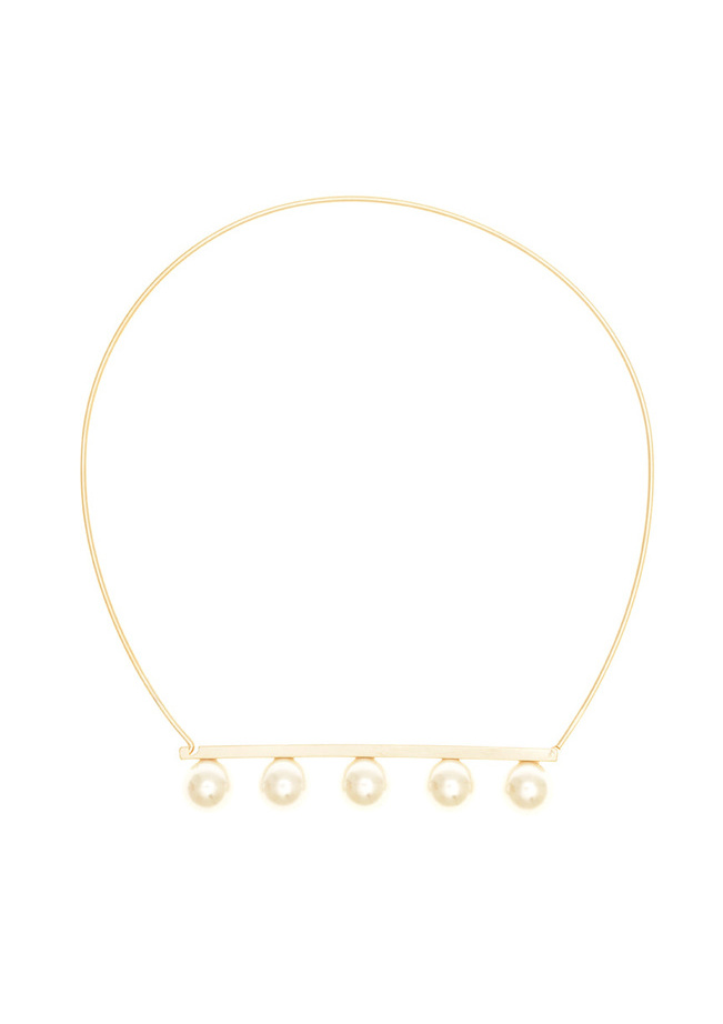 This collar necklace incorporates a flat metal bar with 5 glass pearls, giving a classy appeal to this chic style.