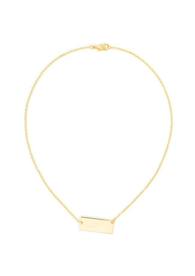 This delicate necklace features a flat bar tag at its center.
