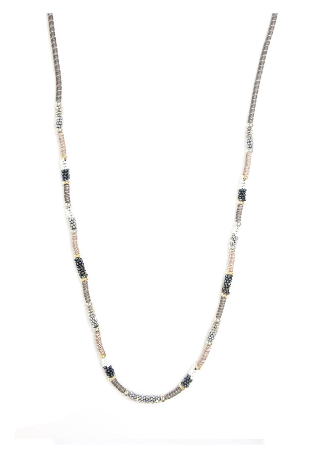 This handmade necklace features a soft velvet rope neck with beaded sections.