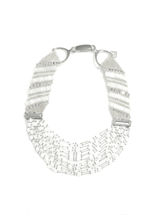 This necklace features a fabric designed interlaced with sparkling beads and various sized gemstones.
