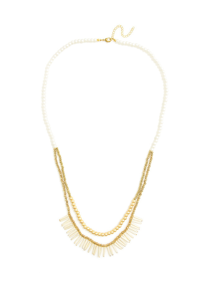 This earthy necklace features a double layered design with a short tassel fringe and matte beads.