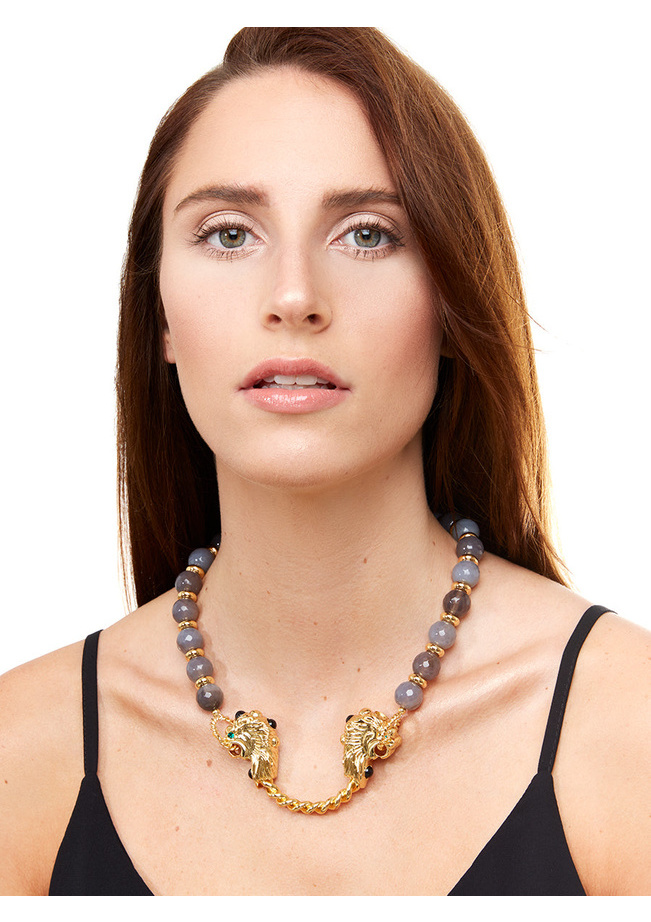 Protect your fierce style with this double sided dragon pendant necklace. With a beaded neckline, this necklace combines edge and sophistication into a single statement.