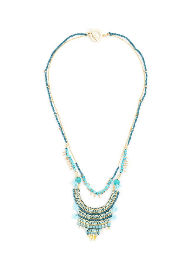 This pre layered handmade necklace features a woven pendant with metal spice detailing and a beaded chain.