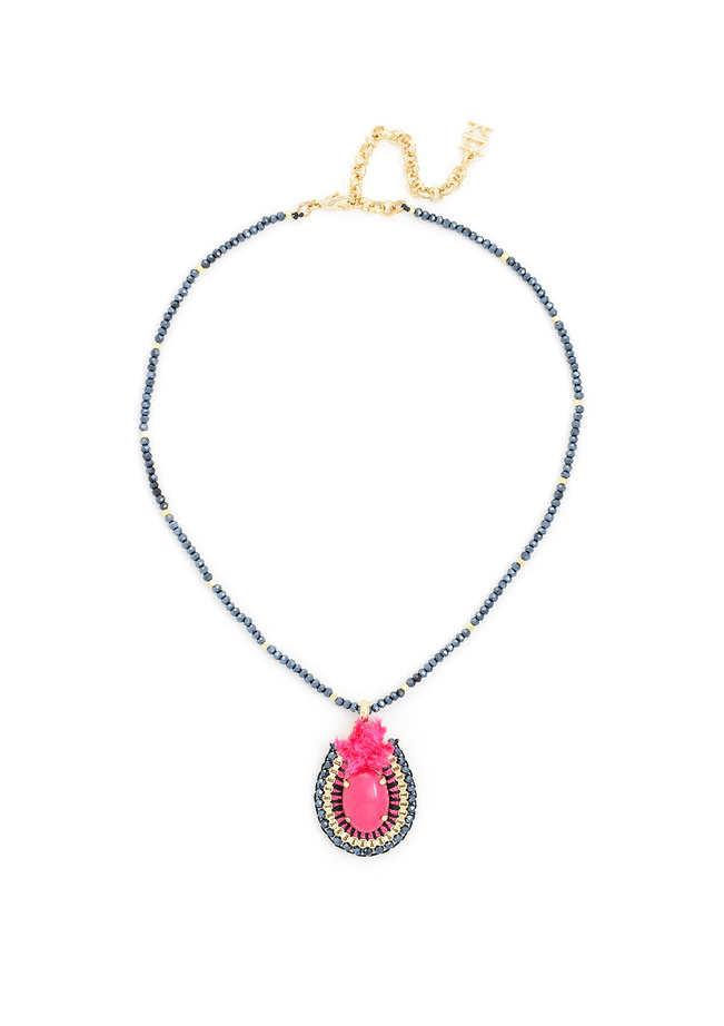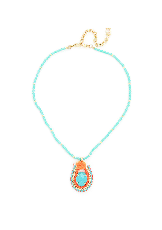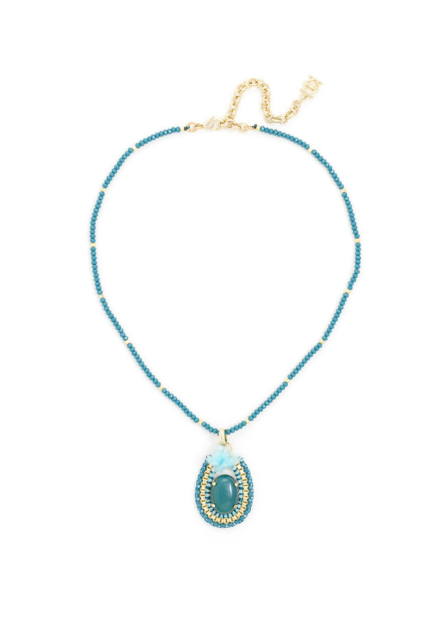 This short handmade necklace features a center stone pendant with a beaded shell and beaded chain.
