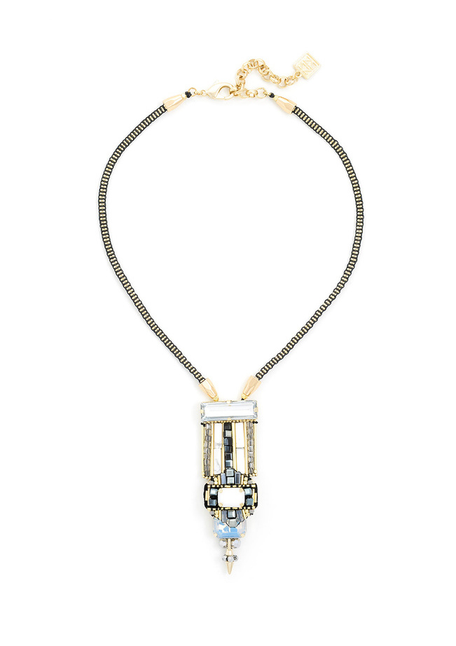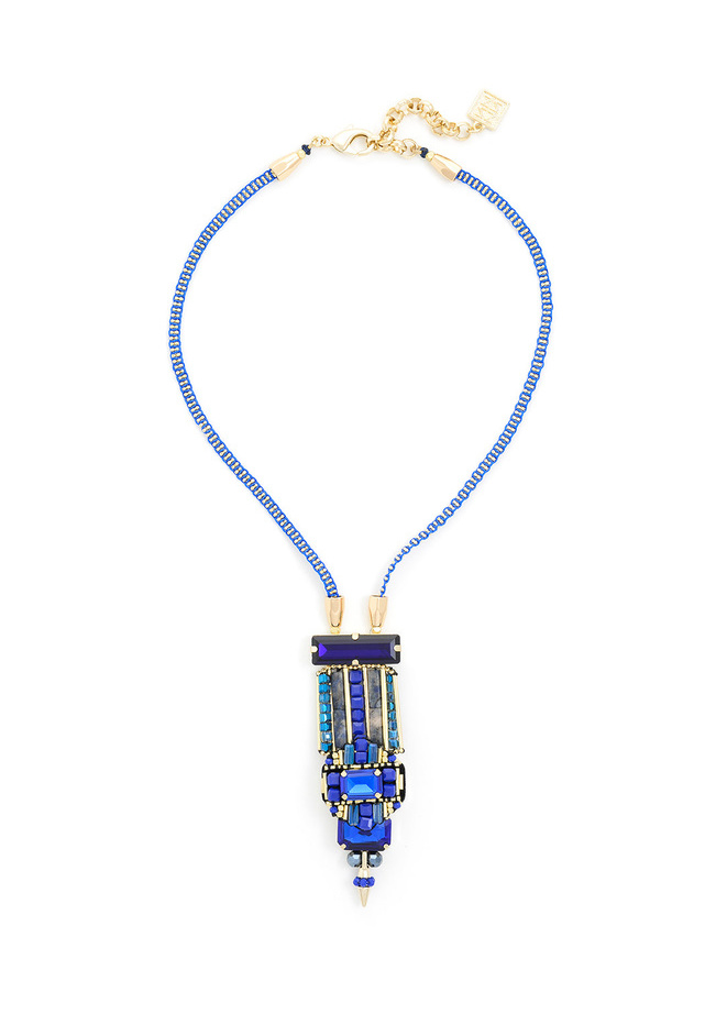 This handmade necklace features a shield pendant and woven detail.