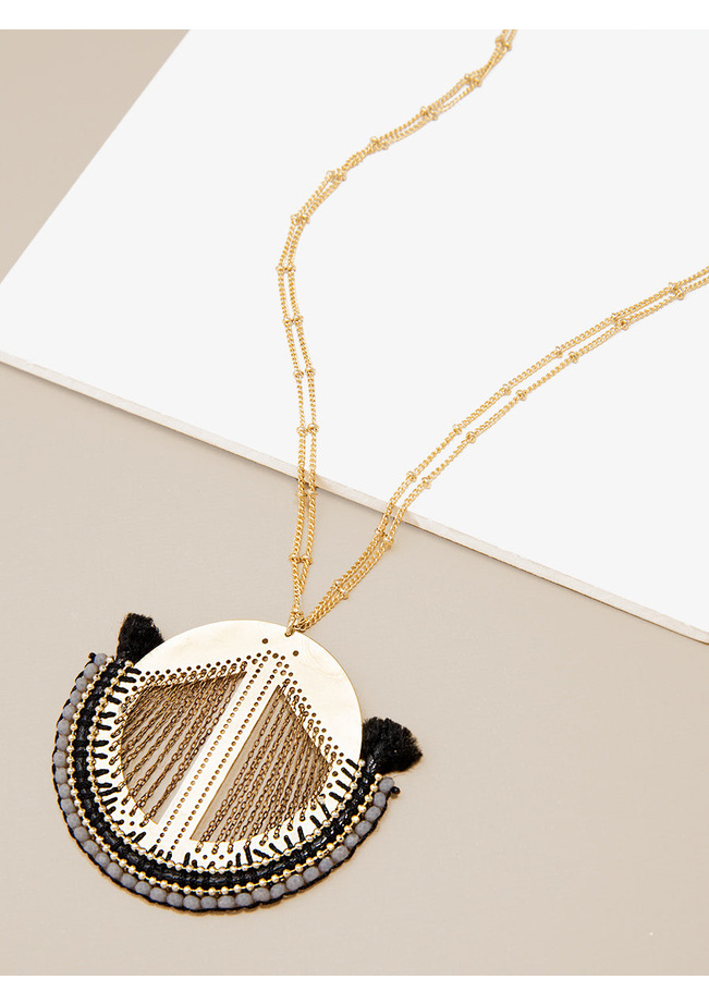This necklace features a center cutout pendant with beaded and fabric detailing.