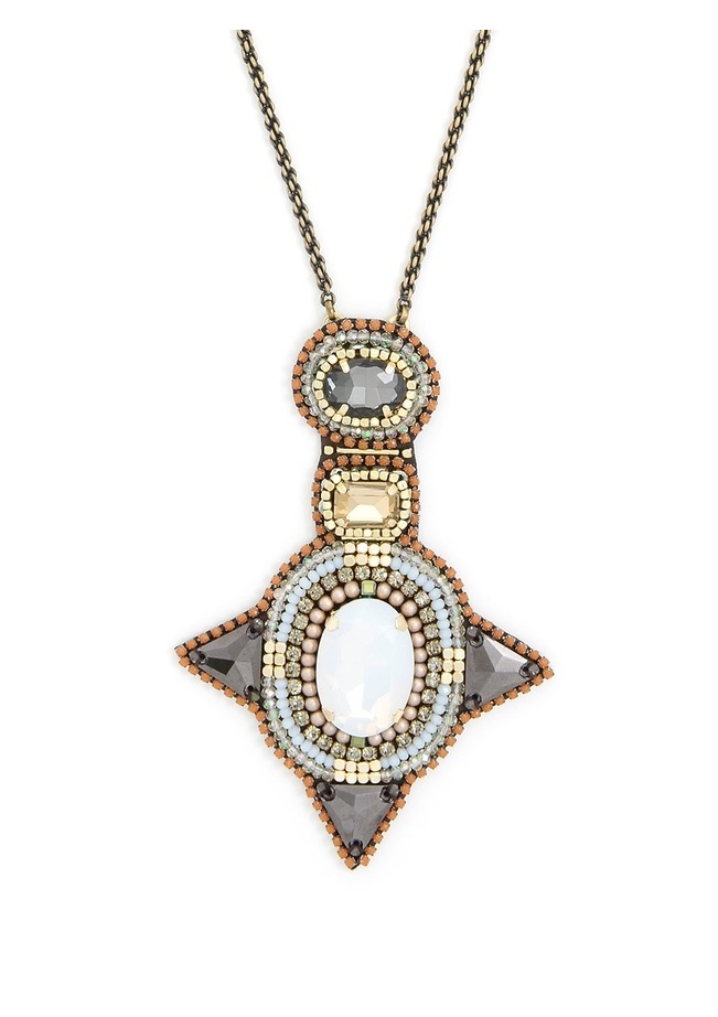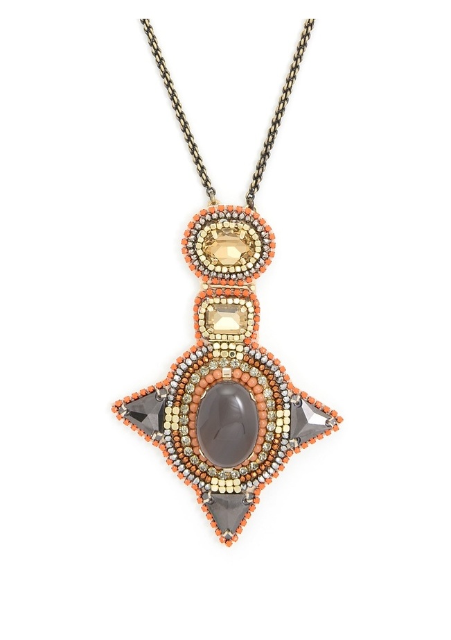 This necklace features a beaded pendant with gemstone accents.