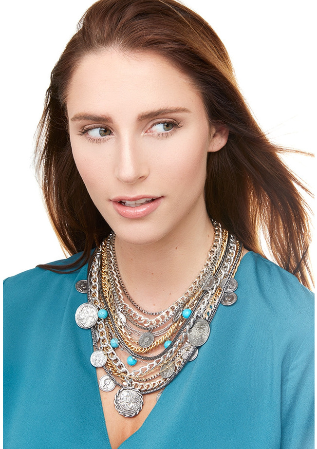 This multi layered necklace features earthy stone, coin charms and various link styles.