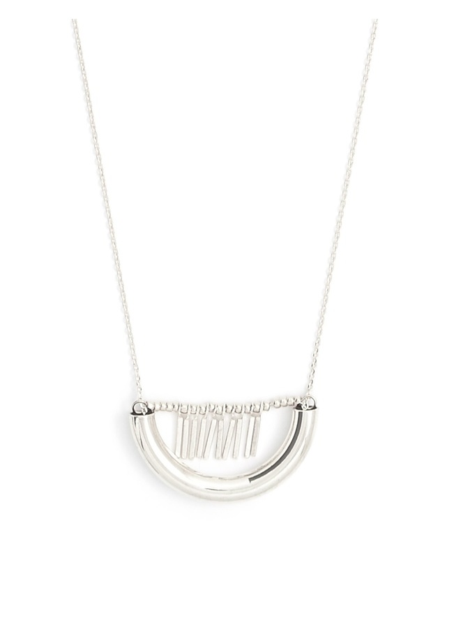 This delicate necklace features a small noodle shaped pendant with mini tassels.