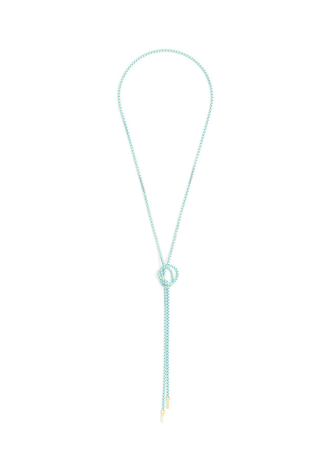 This open lariat necklace features a painted metal chain with mini bar tassels.