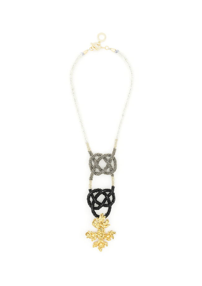 This handmade necklace features a floral design with metal embellishments.