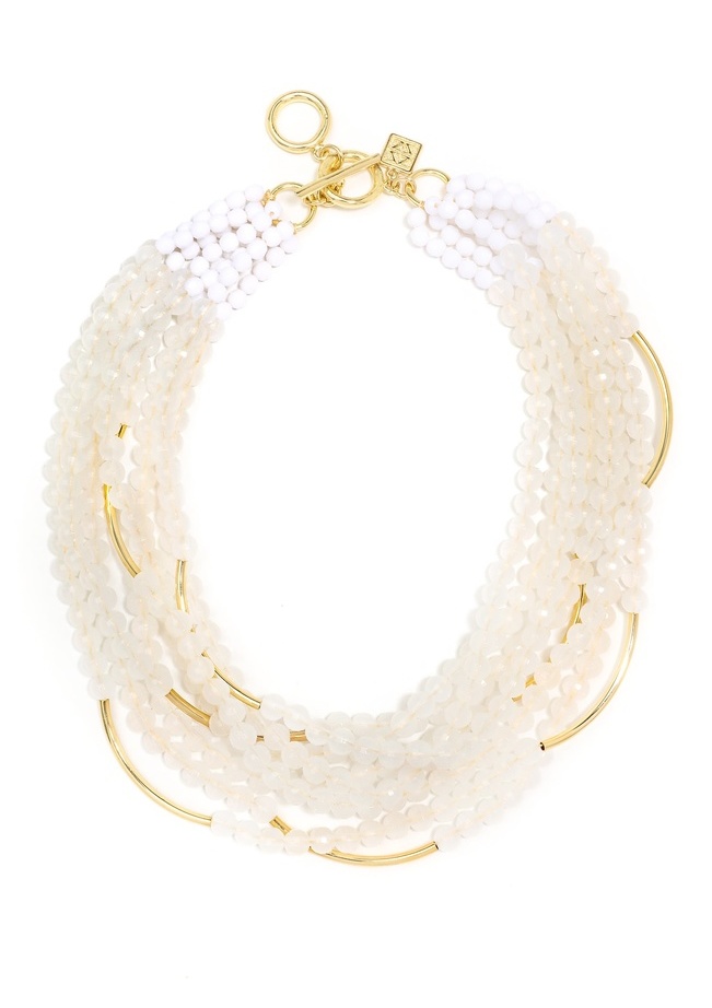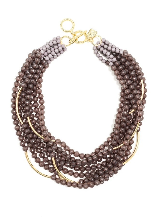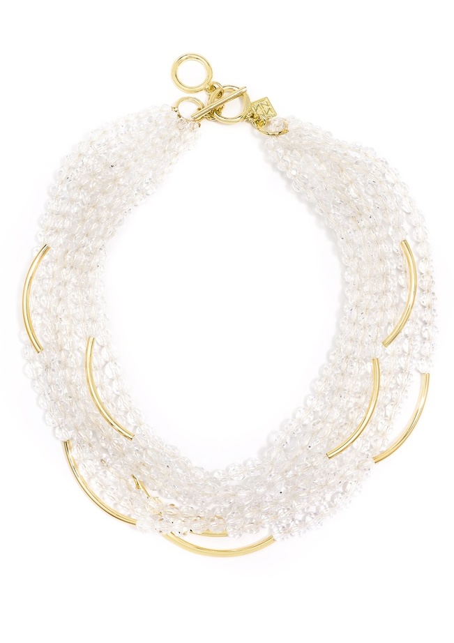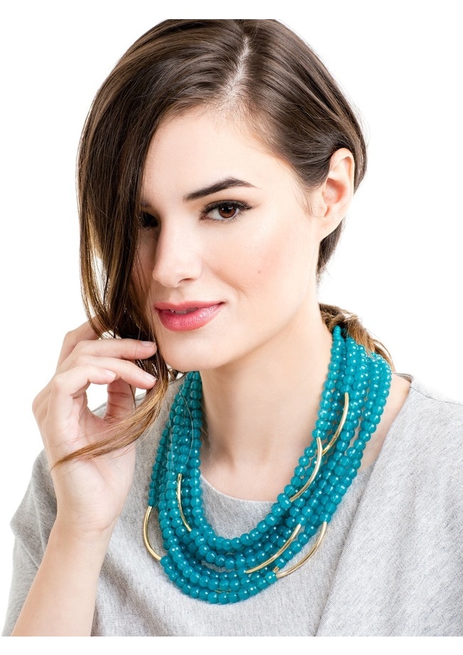 Colorful translucent beads with gold curved bar accents layered in a bib necklace.