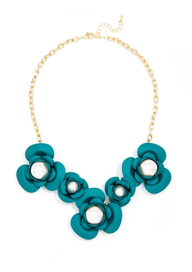 With a whimsical, yet elegant take on pearls, this necklace might just have you feeling as though you've stepped into Wonderland. It's matte, painted metal petals create a rich and luxurious look with any outfit. It can go from fun and flirty day wear, to a classy cocktail outing with ease.