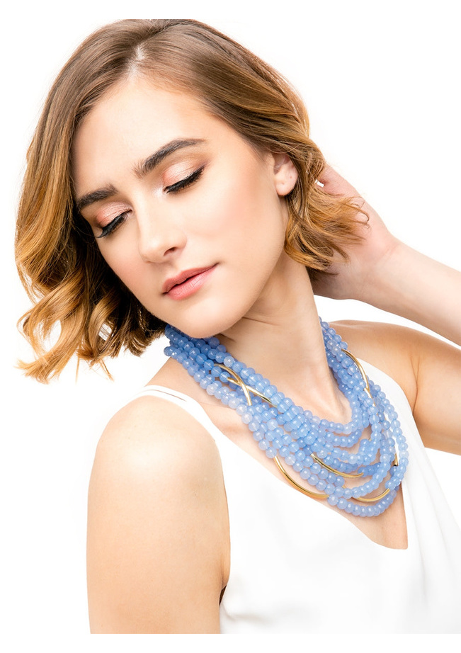 Colorful, pastel translucent beads with gold curved bar accents layered in a bib necklace.