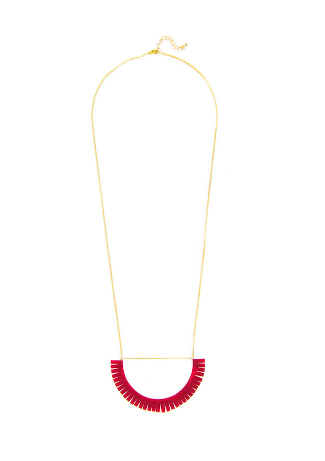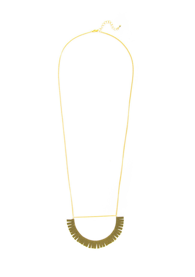 Dainty chain necklace with suede-like fringe detail in half moon shape.
