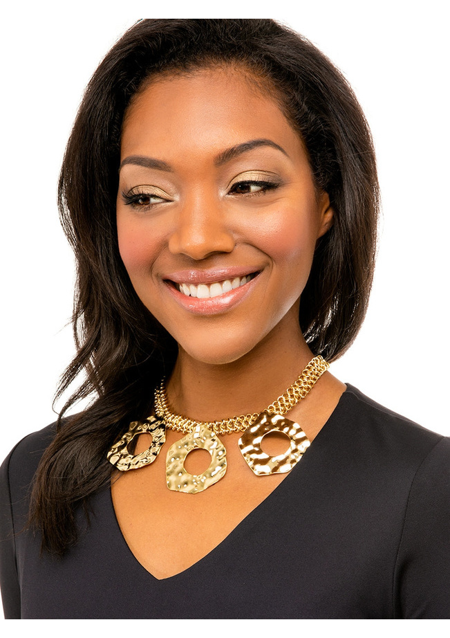 Shiny metal, byzantine chain necklace collar necklace with lobster claw closure. Three medium-sized geometric hammered metal disks are attached at the center.