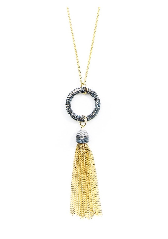 Long 18k gold-plated necklace with painted metal chain-wrapped circle pendant and tassel. Due to the handmade nature of this style, products may slightly vary in color.