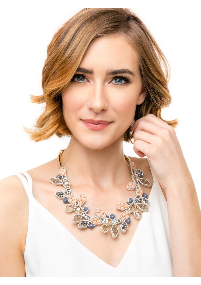 Handmade beaded collar necklace in abstract botanical design with shiny gold metal tubing.