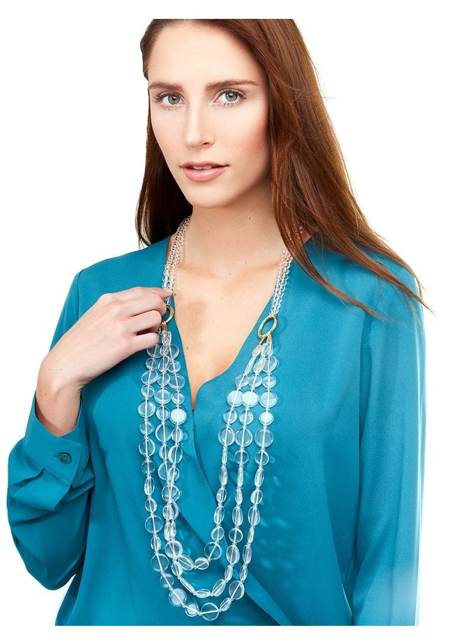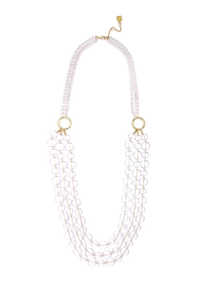 Multi strand, beaded lucite long necklace with gold-tone rings.