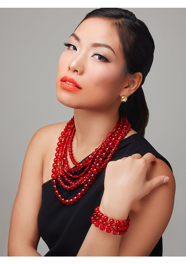 Beaded bib necklace with multiple strands of lucite.