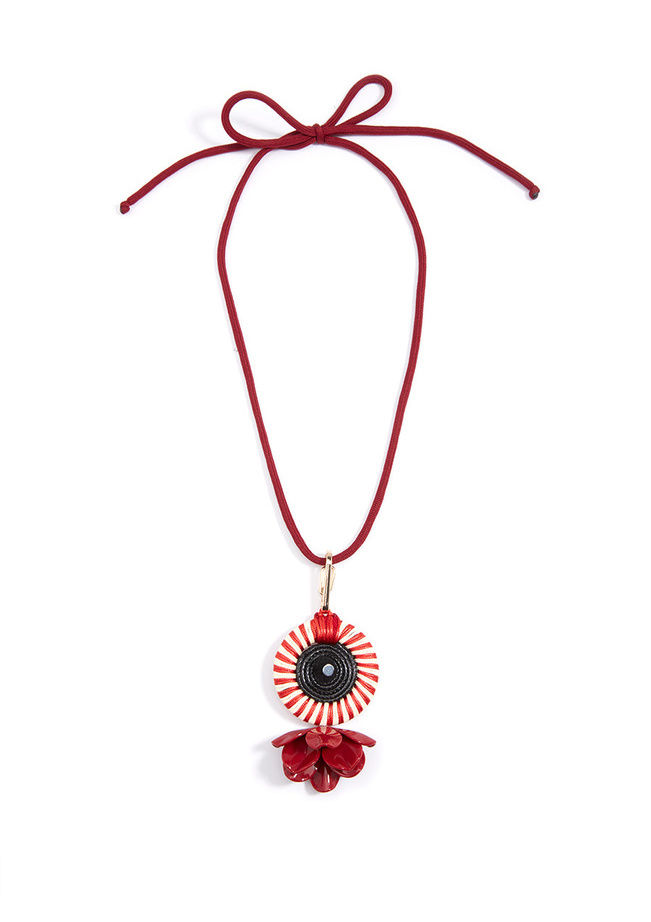 Handmade necklace with a stripped pinwheel in the center and resin flower at the bottom.