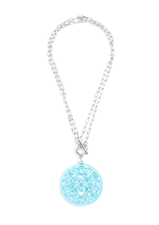 Long, shiny metal chain necklace with a resin pendant in Swirled Circle design. Can be worn as a long necklace or collar necklace.
