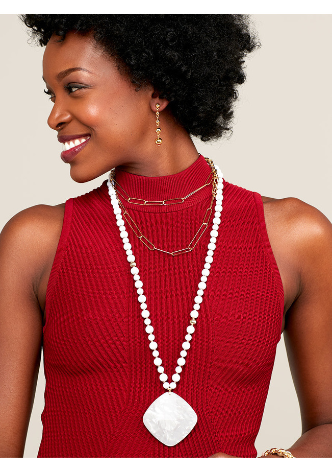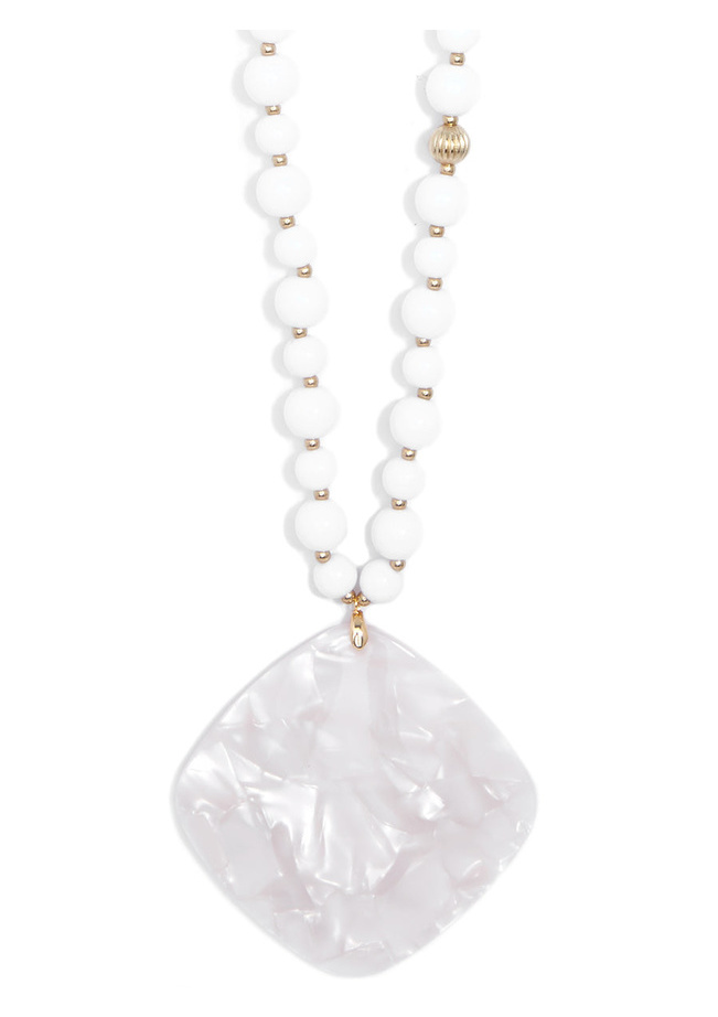 Long beaded necklace with gold-tone accents and a hand-polished square-shaped acetate pendant.