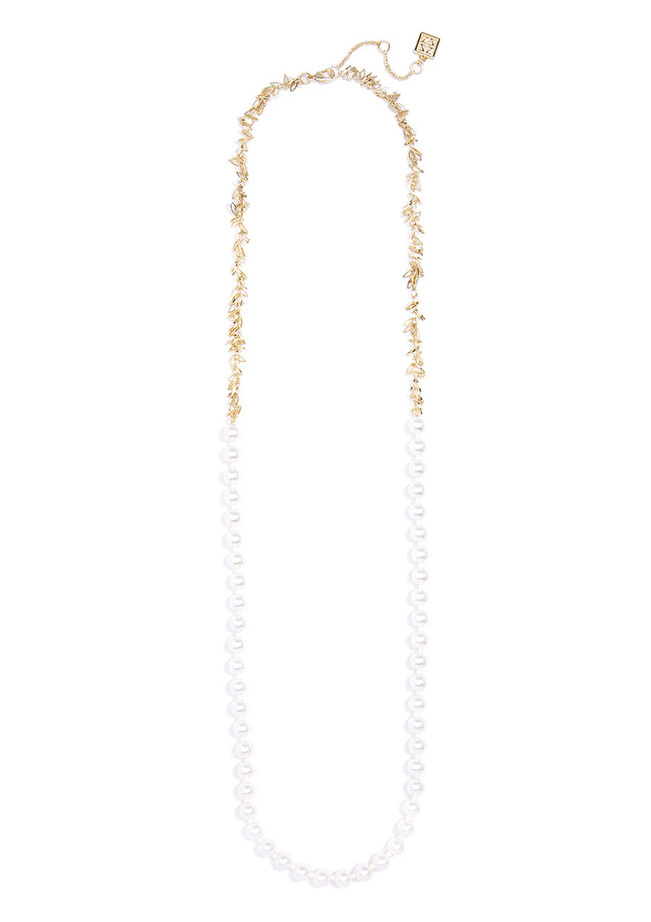 Long, single strand necklace made of premium-grade, faux pearls and clusters of small, shiny leaf-shaped links.
