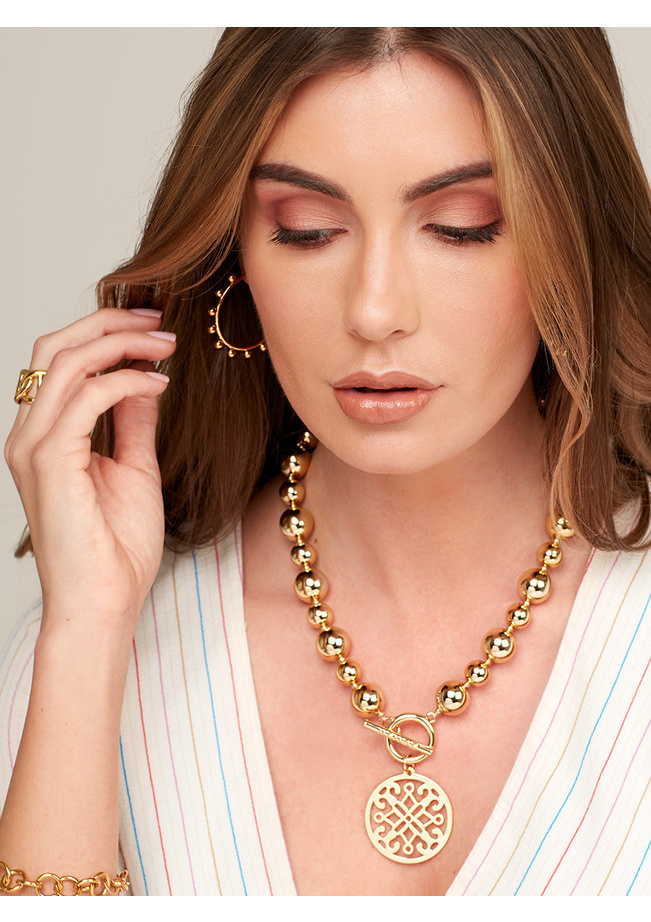 Chunky, beaded shiny metal collar necklace with a laser-cut Ornate pendant with a smooth, polished finish. Features a decorative toggle closure that simplifies putting the necklace on and taking it off.